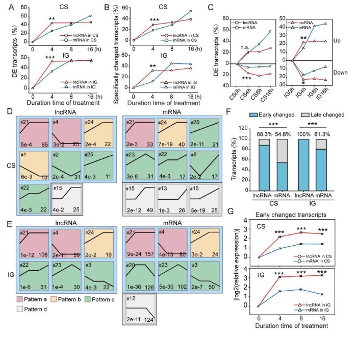為了進(jìn)一步分析lncRNA和mRNA的表達(dá)模式,使用了短時(shí)間序列表達(dá)挖掘器(ShortTime-seriesExpressionMiner,STEM)對(duì)基于表達(dá)的轉(zhuǎn)錄本進(jìn)行聚類。在CS期間,將214個(gè)lncRNA和242個(gè)mRNA分別分為8個(gè)和9個(gè)重要的表達(dá)譜(圖3D)。其中l(wèi)ncRNA表達(dá)譜15以及mRNA表達(dá)譜15、13和16直到群居化處理后8或16小時(shí)才改變。這些配置文件稱為后期更改的配置文件(模式d)。與后期更改的配置文件相反,早期更改的配置文件以4小時(shí)時(shí)間點(diǎn)開(kāi)始的轉(zhuǎn)錄表達(dá)變化為特征。根據(jù)4小時(shí)后的表達(dá)變化,將早期變化的輪廓細(xì)分為模式a(早期變化)、模式b(早期中變化)和模式c(可持續(xù)變化)。在IG過(guò)程中,269個(gè)lncRNA和639個(gè)mRNA分別聚集成6個(gè)和7個(gè)顯著表達(dá)譜。所有l(wèi)ncRNA配置文件均為早期變化(圖3E)。在mRNA表達(dá)譜中,有6個(gè)是早期改變的,而譜12是晚期改變的。在CS和IG期間,lncRNA的聚類分布圖的數(shù)量與mRNA的分布無(wú)明顯差異。但是,通過(guò)計(jì)算譜圖中的轉(zhuǎn)錄本數(shù)量,發(fā)現(xiàn)早期改變的lncRNA的百分比比CS中的mRNA的百分比高61.1%(88.3%vs.54.8%,圖3F)。同樣,IG中早期改變的lncRNA的百分比高于IG中的mRNA(100%vs.81.3%,圖3F)。因此,lncRNA比mRNA對(duì)散居化和群居化處理的反應(yīng)更快。在CS中,早期改變的lncRNA的表達(dá)變化速率快于285個(gè)mRNA的表達(dá)變化速率(0.55vs.0.24)和IG(0.77vs.0.39)(圖3G)。因此,早期改變的lncRNA的比例和表達(dá)變化率高于早期改變的mRNA。因此,蝗蟲(chóng)lncRNA比mRNA對(duì)種群密度的變化更敏感。