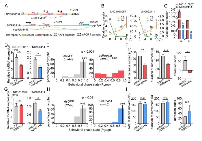 為為了驗(yàn)證LNC1010057和LNC992414在蝗蟲(chóng)型變中的功能,進(jìn)行了一系列分子生物學(xué)實(shí)驗(yàn)。首先,克隆了在LNC1010057和LNC992414基因座中鑒定出的長(zhǎng)的轉(zhuǎn)錄本。LNC1010057由重復(fù)的A、B和C元素組成,這些元素依次分布并重復(fù)4次,但C元素重復(fù)三次(圖5A)。序列比對(duì)證明LNC992414在5’端與LNC1010057共享相似的重復(fù)序列,但是它們是從不同的基因組基因座轉(zhuǎn)錄而來(lái)的(圖5A)。盡管LNC992414的定量表達(dá)水平可以通過(guò)特異性引物檢測(cè),但LNC1010057的表達(dá)水平為重復(fù)元件的總表達(dá)水平。如預(yù)期的那樣,LNC1010057和LNC992414的表達(dá)模式極為相似。在CS期間,兩種lncRNA的表達(dá)持續(xù)增加,并且在16h幾乎增加了四倍(圖5B)。在IG期間,4h后表達(dá)水平顯著下降,之后保持相對(duì)穩(wěn)定(圖5B)。LNC1010057和LNC992414之間的序列結(jié)構(gòu)和表達(dá)模式的相似性表明它們是同源的lncRNA。但是,實(shí)時(shí)qPCR分析表明,在散居型和群居型蝗蟲(chóng)的大腦中,LNC1010057的表達(dá)水平比LNC992414的表達(dá)水平高約1000倍(圖5C)。其次,為了測(cè)試LNC1010057和LNC992414是否參與蝗蟲(chóng)型變調(diào)節(jié),在通過(guò)RNAi抑制蝗蟲(chóng)大腦中的表達(dá)后進(jìn)行了行為分析。顯著降低LNC1010057的表達(dá)水平(7470對(duì)3764610)和LNC992414(1.9vs.1.0)(圖5D)后行為分析表明,群居型蝗蟲(chóng)其行為顯著改變?yōu)樯⒕訝顟B(tài)(圖5E)。此外,多個(gè)與型有關(guān)的行為參數(shù)發(fā)生了變化??傄苿?dòng)距離(TDM)和總移動(dòng)持續(xù)時(shí)間(TDMV)顯著降低(圖5F),但是,移動(dòng)速度沒(méi)有區(qū)別。同時(shí)群居蝗蟲(chóng)的特定喜好行為顯著下降(58.3對(duì)-13.5圖5F)。但LNC992414表達(dá)降低并未引起從群居狀態(tài)到散居狀態(tài)的轉(zhuǎn)變(圖5G和H)。與對(duì)照相比,與型相關(guān)的行為參數(shù)(包括運(yùn)動(dòng)和特定物種的優(yōu)選行為)沒(méi)有差異(圖5I)。LNC992414的RNAi實(shí)驗(yàn)不會(huì)引起行為變化,因此排除了LNC992414調(diào)節(jié)蝗蟲(chóng)型變的可能性。這些結(jié)果表明是LNC1010057而不是LNC992414潛在地調(diào)節(jié)了蝗蟲(chóng)的型變。