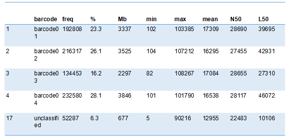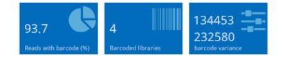 在加入barcode序列混樣測序的情況下,barcode識別區(qū)分的結(jié)果展示如下,包括barcode識別效率,區(qū)分的文庫個數(shù)及每個文庫中序列個數(shù)占比和長度信息等。