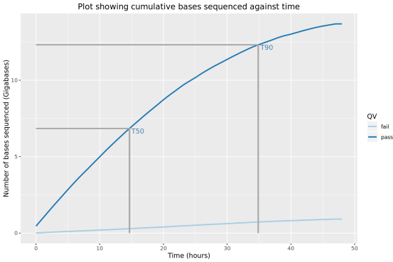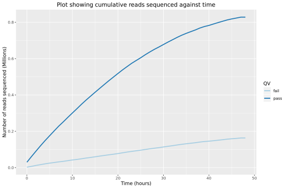 上述分析完成后會將分析結(jié)果存放至HTML文件,可用瀏覽器打開Nanopore_SumStatQC_Tutorial.html進行查看。對單個芯片約1M reads分析的部分結(jié)果展示如下(結(jié)果來自教程,堿基識別使用Guppy 2.1.3,根據(jù)識別序列的平均質(zhì)量值將其分為pass和fail兩種,質(zhì)量值閾值默認為7):