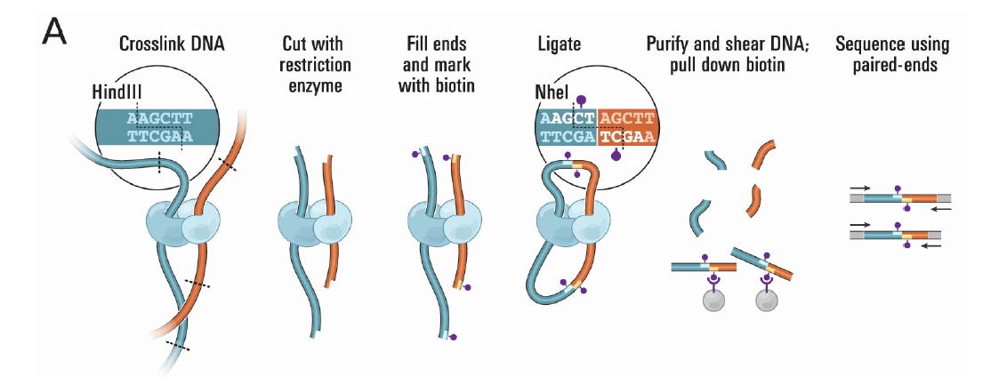 Hi-C技術(shù)是染色質(zhì)構(gòu)象捕獲技術(shù)( Chromosome conformation capture )與高通量測序( High-throughput sequencing )結(jié)合衍生的一種技術(shù)。主要是利用全基因組范圍內(nèi)整個染色質(zhì)DNA在空間位置上的關(guān)系,對染色質(zhì)內(nèi)全部DNA相互作用模式進行捕獲,結(jié)合生物信息學(xué)方法,來獲得染色體水平的基因組序列并得到染色質(zhì)三維結(jié)構(gòu)信息。此外還可以并與Chip-seq、轉(zhuǎn)錄組數(shù)據(jù)聯(lián)合分析,從基因調(diào)控網(wǎng)絡(luò)和表觀遺傳網(wǎng)絡(luò)來闡述生物體性狀形成的相關(guān)機制。