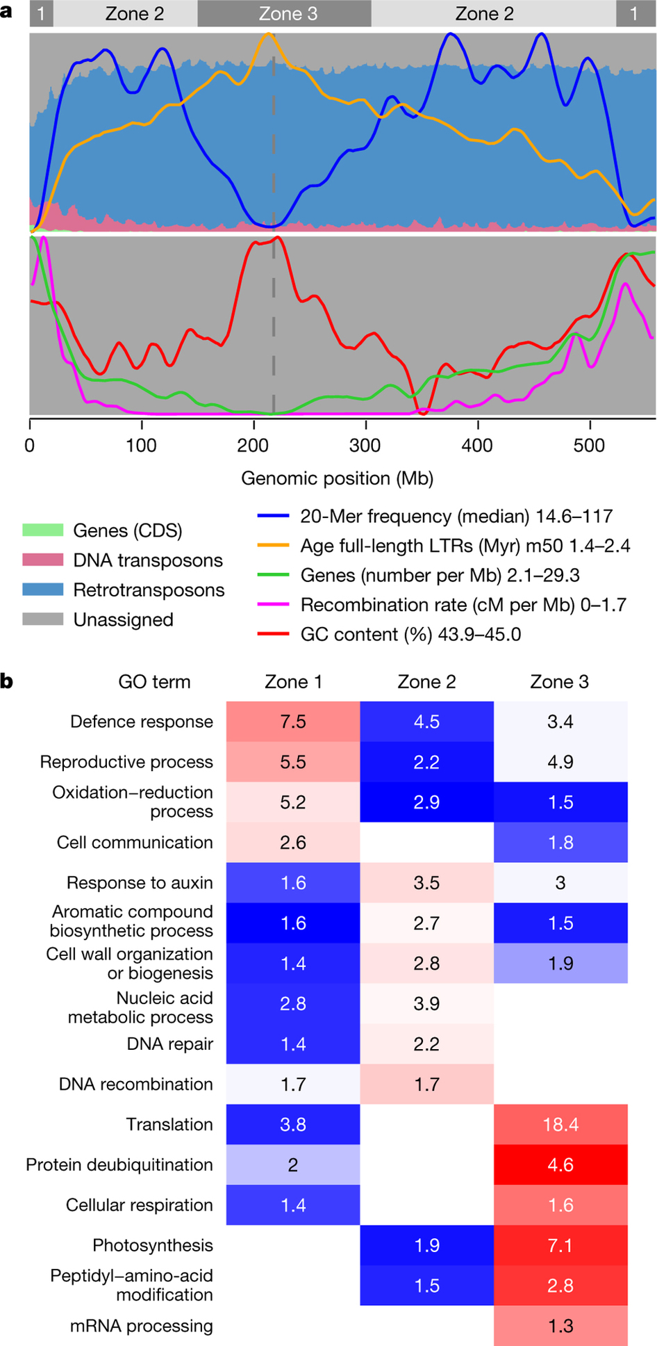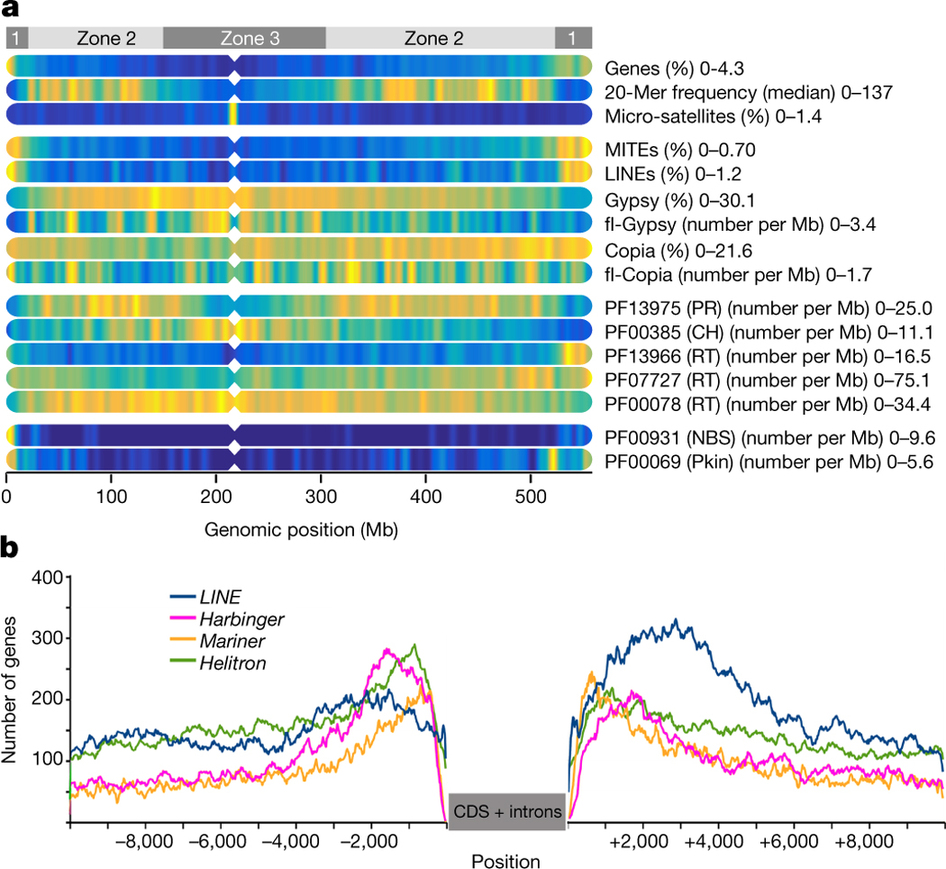 利用染色體位置信息,通過對20-mer頻率將染色體進行劃分成了三種區(qū)域,每種區(qū)域上在基因密度,重組率,LTR插入時間以及GC含量上都存在一定的規(guī)律。