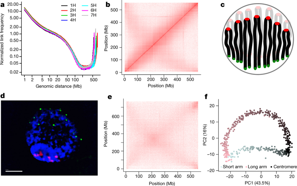 通過HIC熱圖作者發(fā)現(xiàn)無論是染色體內(nèi)部還是染色體間的長短臂之間都存在較強的交互信號。按照HIC的原理來說,染色體上空間作用越強則實際DNA間的物理距離越近,染色體大小臂及不同染色體間的相互作用應(yīng)該是極弱的。為了找出原因,作者通過對大麥葉核間期的細胞進行著絲粒及端粒熒光雜交,發(fā)現(xiàn)所有染色體的端粒和著絲粒在空間上的位置都純在極性,且排列方式也極其相似,不同染色體間的大小臂其實在空間上距離很近,因此確實存在染色體內(nèi)外大小臂之間大量的交互作用的可能。