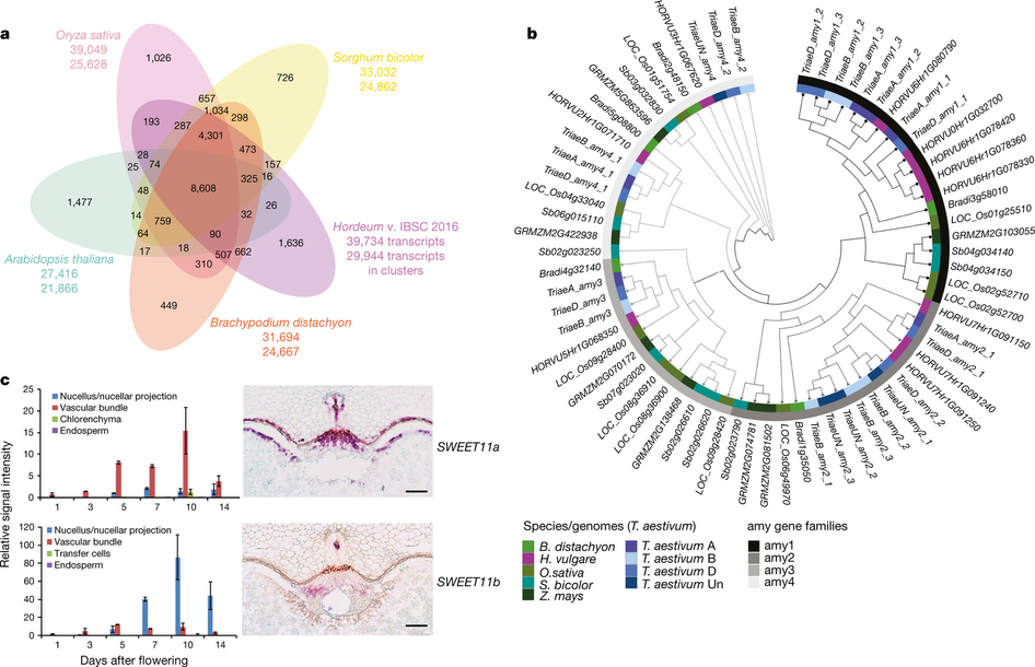 通過對大麥基因組進行基因家族收縮擴張分析發(fā)現(xiàn),收縮擴張的家族中*顯著的部分都與植物防御及抗病相關(guān)。另外,作者對麥芽品質(zhì)相關(guān)的amy家族及糖代謝相關(guān)的SWEET家族進行了亞家族分類,多倍化及表達模式相關(guān)的分析。