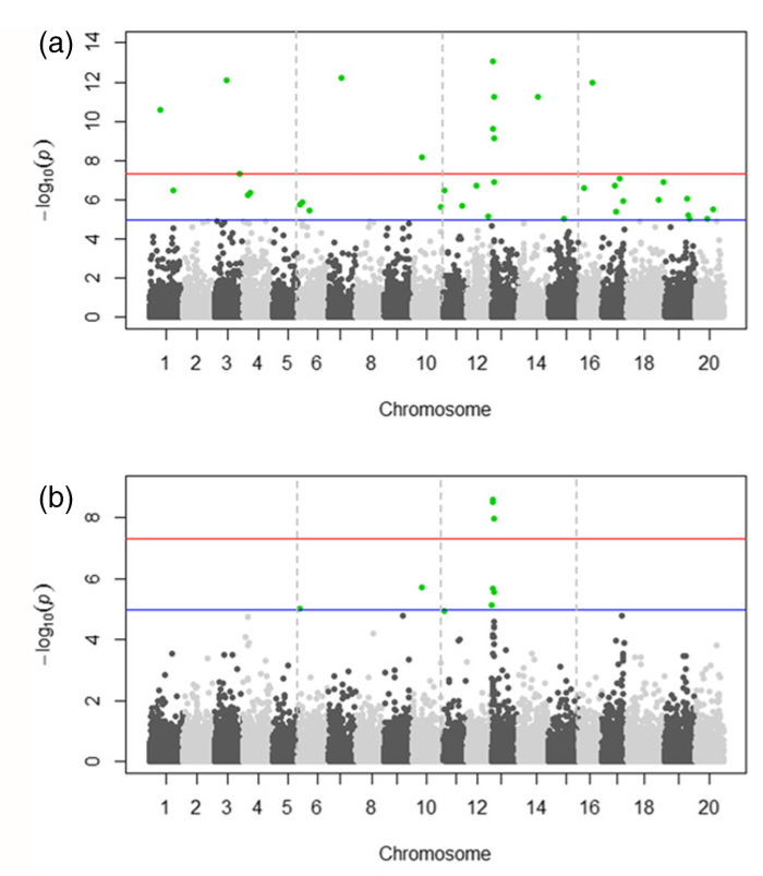 The x-axis shows the single nucleotide polymorphism (SNPs) along each chromosome; the y-axis is the –log10(P-value) for the association. Genome-wide P-values from the generalized linear model (GLM) and compressed mixed linear model (CMLM). Colored dots in (a) and (b) indicate SNPs with P-values < 1.99 9 106 (a < 0.05) in both models.