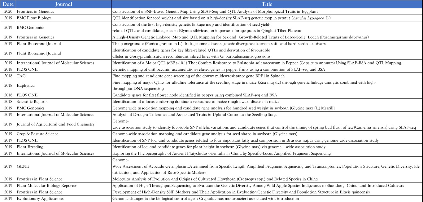 SLAF-seq is a cost-effective strategy for large-scale genetic studies of animal and plant populations, and has been widely used in genetic evolution, GWAS, genetic mapping, BSA, and marker development.