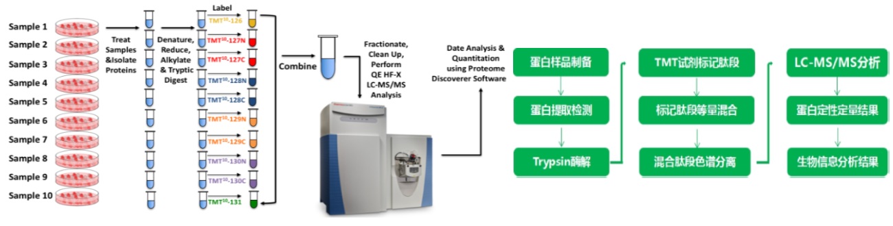 TMT(Tandem Mass Tags)有美國Thermo 公司研發(fā)的多肽體外標記定量技術(shù),采用16種同位素標簽,通過特異性標記多肽的氨基酸基團,一次上機可實現(xiàn)16不同樣本中蛋白質(zhì)的相對定量,是近年來定量蛋白質(zhì)組學(xué)常用的高通量篩選技術(shù)。