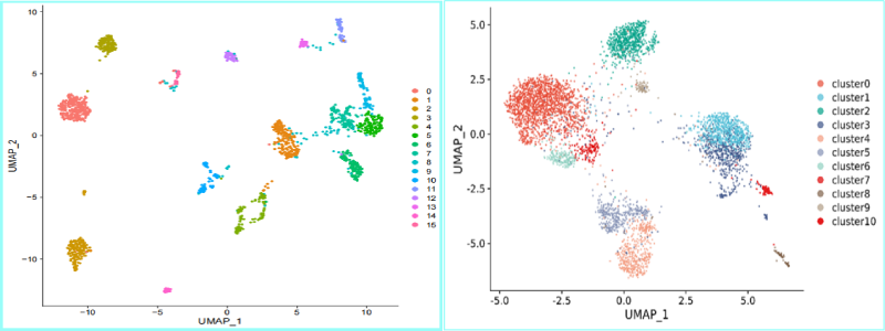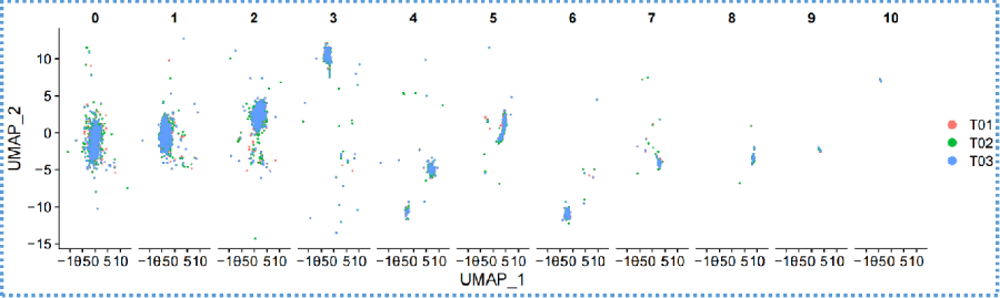 將相同的PBMC細(xì)胞懸液分3份,通過3個不同實驗人員,用3臺百創(chuàng)DG1000儀器,獨立進(jìn)行單細(xì)胞測序,得到了幾乎一致的細(xì)胞聚類分群結(jié)果,證明百創(chuàng)DG1000具有很好的可重復(fù)性及穩(wěn)定性。