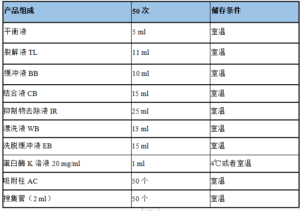 1.獨特配方:含特殊的結合液/蛋白酶K,能迅速裂解細胞和滅活細胞內核酸酶;經(jīng)過漂洗-離心,清除細胞代謝物、蛋白等雜質。