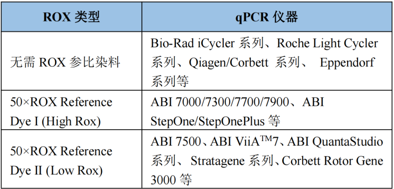 圖1:不同儀器所需ROX Reference Dye不同,請參考上述機型。
