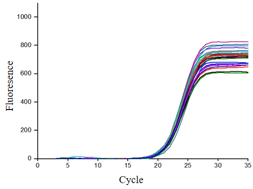2.重復(fù)性檢測:分別設(shè)置30個復(fù)孔,擴增相同的基因,發(fā)現(xiàn)擴增曲線的Ct值幾乎一致。