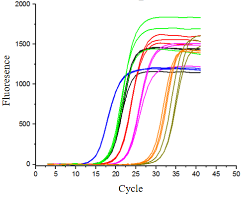 圖4:物種多樣性檢測:分別以不同物種、不同濃度的RNA為模板,進行一步法RT-qPCR擴增。包括人肝癌(藍色);果蠅(綠色);小鼠腸道(黑色);番茄果(紅色);日本水稻(紫色);辣椒(橙色);石斑魚(灰色)。